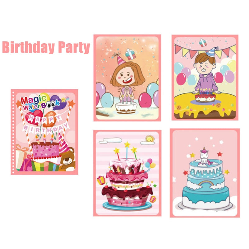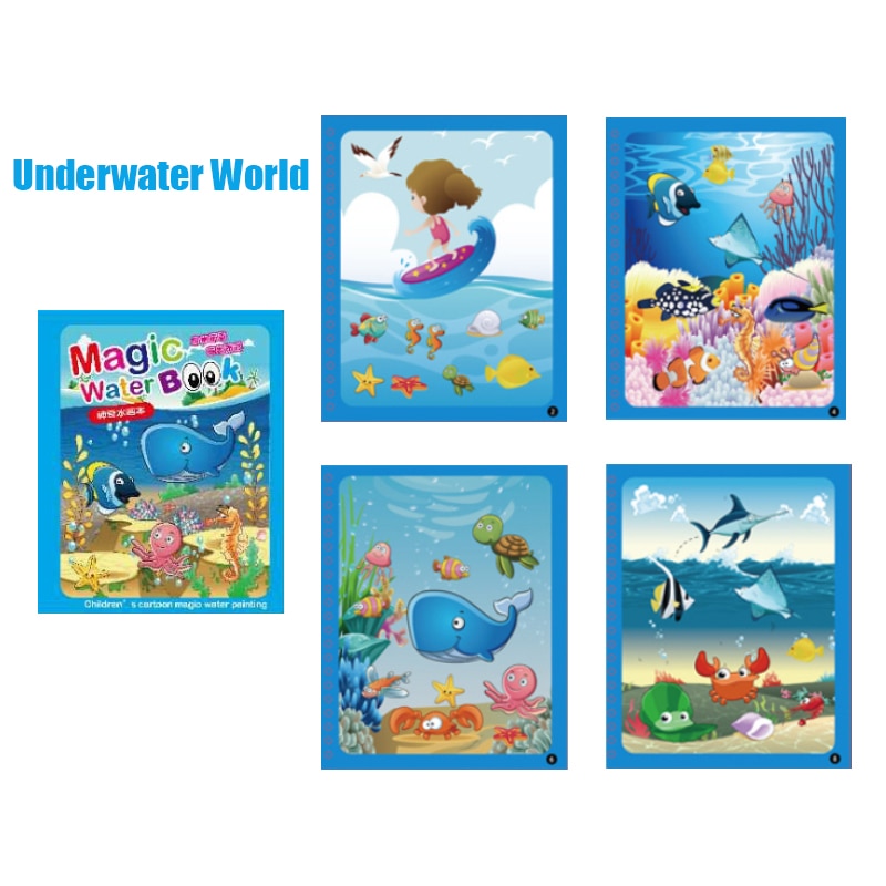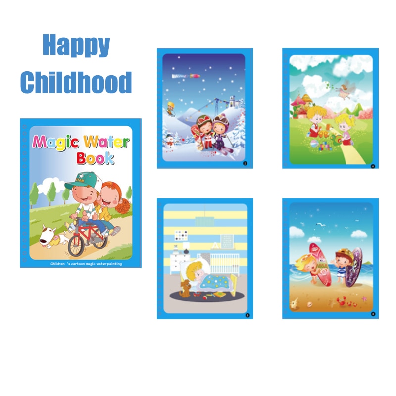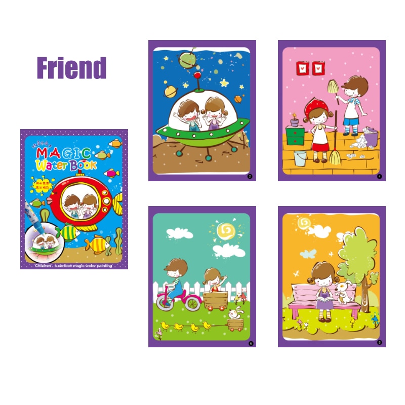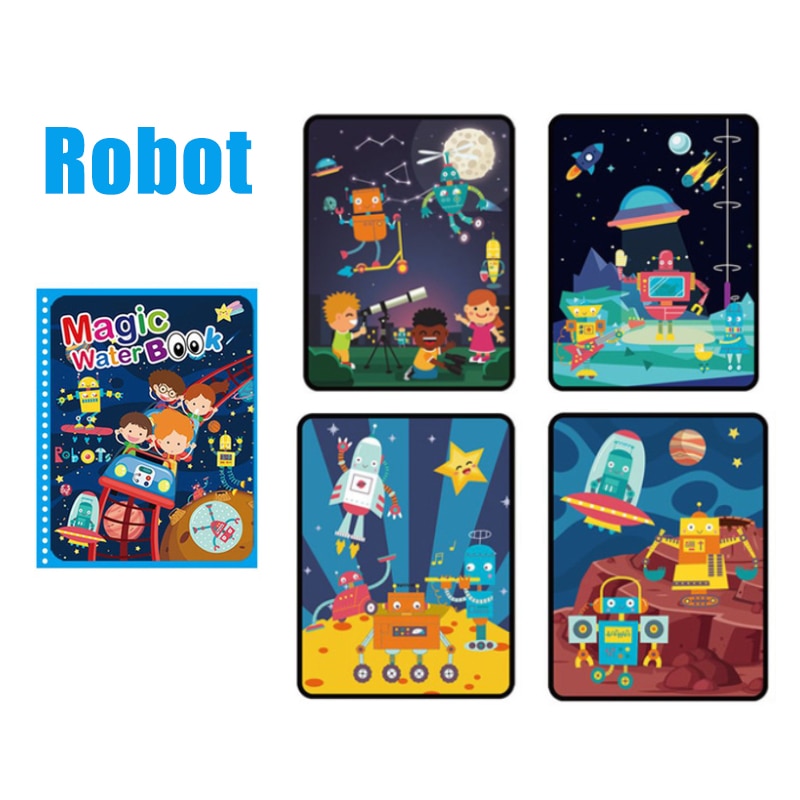 Cada livro possui 4 páginas reutilizáveis e uma caneta de água recarregável.